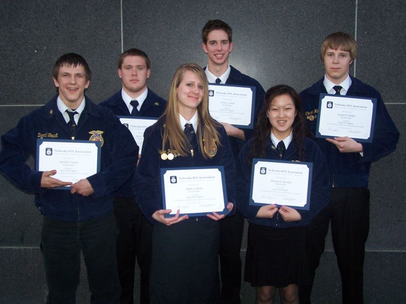 The Nebraska State FFA Degree is the highest honor the Nebraska FFA Association can bestow upon its members. Receiving the Nebraska State FFA Degree from the Heartland FFA Chapter were Brittany Ratzlaff, Jaylen Peters, Connor Hiebner, Jarred Erb, Darrell Traudt and Travis Jensen.