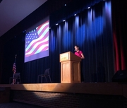 Mr. Carr then presented the winners of the secondary essay contest. Second place winner Tara B. shared her essay with gratefulness for the freedoms she is able enjoy, and winner Georgia K.'s recorded essay emphasized thanks for the veterans and also for their supportive families.