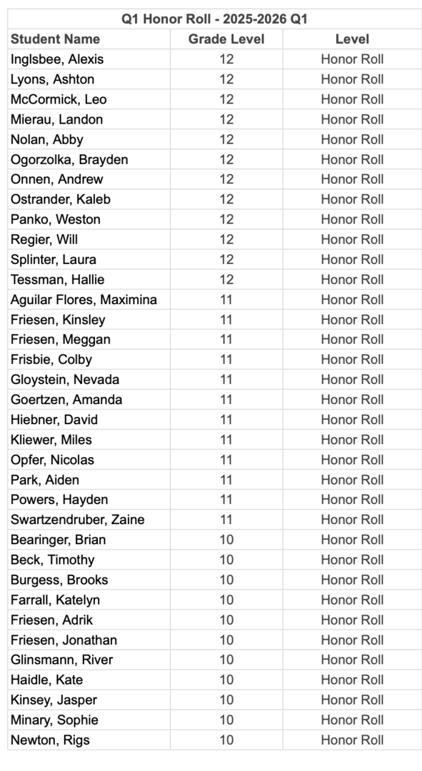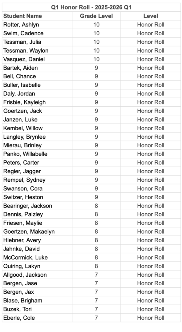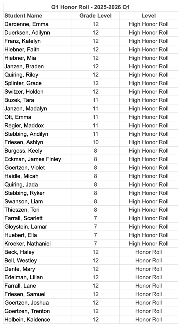 Congratulations to the students who made the honor roll for the first quarter of the 2025-26 school year.