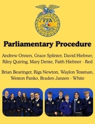 Finally, members have a chance to demonstrate their knowledge about parliamentary procedure, a way to run meetings efficiently and expediently. Freshmen members competed in Conduct of Chapter Meetings and received a blue. Team members included Luke Janzen, Jagger Regier, Willabelle Panko, Carter Peters, Sydney Rempel, Wyatt Friesen, Roman Wolfe. Sophomores through seniors compete in another variation of the contest, known as parliamentary procedure. This year, Heartland had two teams in parliamentary procedure. Receiving a red ribbon were team members: Andrew Onnen, Grace Splinter, David Hiebner, Riley Quiring, Mary Dente, and Faith Hiebner. Receiving a white ribbon were team members: Brian Bearinger, Rigs Newton, Waylon Tessman, Weston Panko, and Braden Janzen.